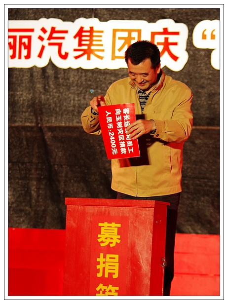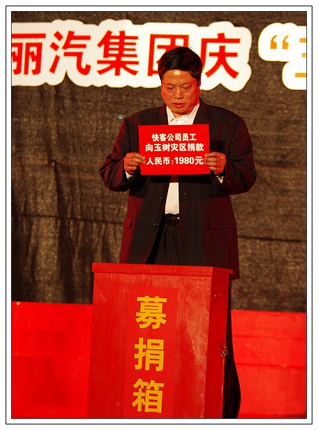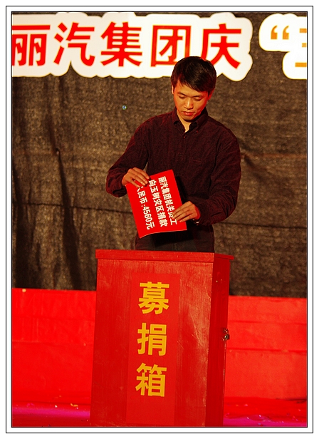 演唱會(huì)上,麗汽集團(tuán)員工為玉樹(shù)地震災(zāi)區(qū)進(jìn)行了捐款,所募集的21981元善款轉(zhuǎn)交市慈善總會(huì)。
