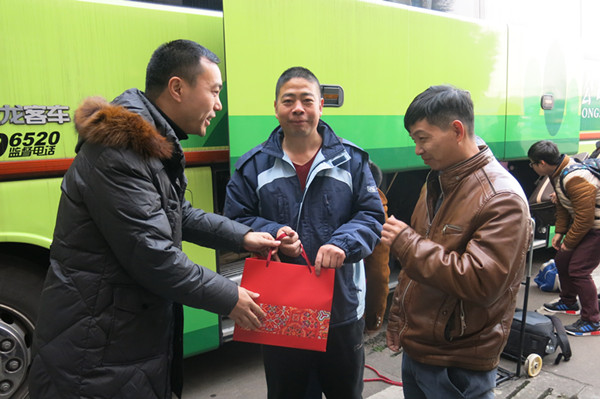 旅游集散中心領(lǐng)導(dǎo)走到每一位參與春運(yùn)加班和民工返鄉(xiāng)包車的駕駛員身邊,送上慰問品,并叮囑駕駛員路途注意安全,在駕車時(shí)必須控制好車速,特別是在駛經(jīng)彎道、坡路、橋梁、窄路和視線不良、交通流量大的路段或遇到下雨、下雪、大霧等惡劣天氣時(shí),更要按照限速規(guī)定嚴(yán)格控制車速,避免發(fā)生交通事故;并做好保暖工作,搭班駕駛員互相照應(yīng),不能疲勞駕駛,注意自身健康。