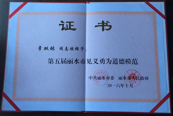 在10月31日,章雙林還獲得麗水市第五屆見義勇為道德模范,受到市委市政府表彰。