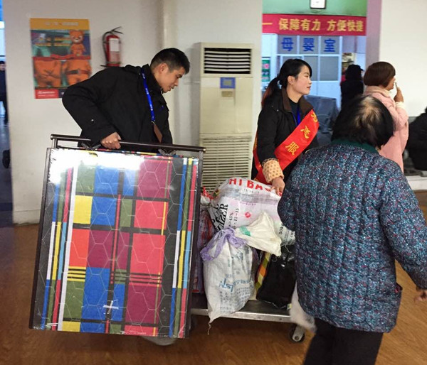 2月28日上午9點(diǎn)多,東站售票廳里一位70多歲的大媽正吃力地拖著一袋滿滿的東西往危檢儀挪動(dòng)。正在服務(wù)臺(tái)上班的劉虹看見(jiàn)了,趕緊推著“流動(dòng)之家”服務(wù)小推車(chē)上前幫忙。當(dāng)劉虹幫著大媽一起把那一大袋物品放上小推車(chē)后,大媽吞吞吐吐地說(shuō)道“姑娘,在外面門(mén)口我還有幾袋東西,我的班車(chē)時(shí)間又快到了,你看能不能幫忙把我那幾袋一起推進(jìn)去?。俊笨粗髬屒笾难凵?,深知旅客出門(mén)不易的劉虹沒(méi)有猶豫,問(wèn)了聲“東西在哪里”后就隨著大媽來(lái)到東站南大門(mén)口。