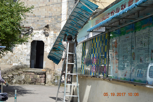 今天項目開工,沒有儀式,一切以簡潔經(jīng)濟為考量。工程負責人員進駐項目部后,工人隨即就開始粉刷外墻、拆除櫥窗等工作。