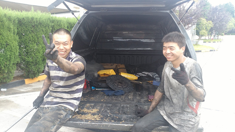 由于受臺風(fēng)影響,到達(dá)服務(wù)區(qū)時(shí)雖正值瓢潑大雨,但維修工陳永峰、李建波毫無怨言,立即投入到緊張的維修工作中去。由于受搶修場地的限制,他倆不能躺在木制躺板上進(jìn)入低底盤的車底,只能在流淌著雨水的地上鋪上一塊紙板,趴在車廂底下工作,不一會兒他倆的衣服就濕透了,非常辛苦。時(shí)而烈日當(dāng)空,時(shí)而滂沱大雨的臺風(fēng)天,兩位維修師傅的衣服也是濕了干、干了濕,經(jīng)過努力,終于排除故障,完成搶修任務(wù)。