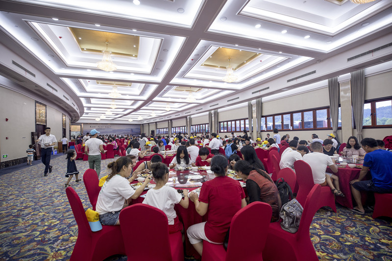8月13日晚上,九城宴會(huì)中心熱鬧非凡,宴會(huì)大廳及休閑中廳擺滿了桌椅,紅色的桌椅布套顯得格外喜慶,酒店門(mén)前停滿了旅游大巴車(chē),進(jìn)店的游客排起了長(zhǎng)長(zhǎng)的隊(duì)伍,這是九城宴會(huì)中心自開(kāi)業(yè)以來(lái)接待的首場(chǎng)千人宴。
