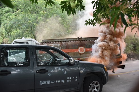 6月29日10時32分,市區(qū)330國道馬蹄凹地段(靈山寺腳8路公交車終點站),一輛危險物品運輸車與小貨車、三輪車相撞,危險品運輸車罐體嚴(yán)重?fù)p壞、現(xiàn)場濃煙滾滾,泄漏的危險物品隨時有燃燒爆炸的可能,連空氣中都彌漫著一股緊張的氣息……