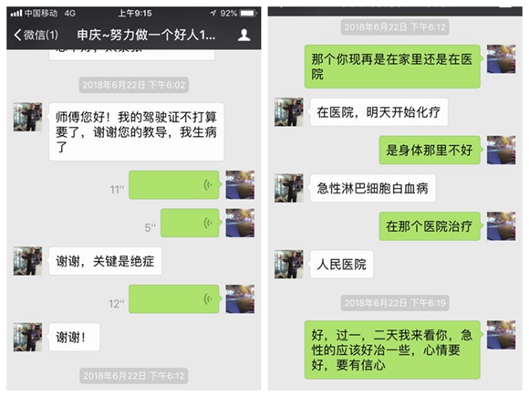 經(jīng)核實,這條消息是浙K0058教練車學(xué)員梅申慶發(fā)出的求助消息,該車教練員周偉在6月22日也收到了學(xué)員梅申慶的微信留言,表示不能繼續(xù)學(xué)車了,周偉就很納悶,問他好好為什么不學(xué)了。梅申慶回答說自己生病了,而且得的是絕癥--突發(fā)性白血??!周偉教練當(dāng)時感到很震驚,想不到前幾天來學(xué)車時還好好的一個學(xué)員,怎么突然間就得了重病。他知道白血病治療需要巨額費(fèi)用,梅申慶家經(jīng)濟(jì)條件又不是很好,當(dāng)即發(fā)了188塊微信紅包鼓勵梅申慶樹立信心、積極接受治療。