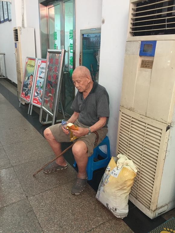 8月16日下午,一位老大爺在東站售票廳里,迷茫地走來走去,由于年歲已高,他走的每一步都顯得有點(diǎn)力不從心。