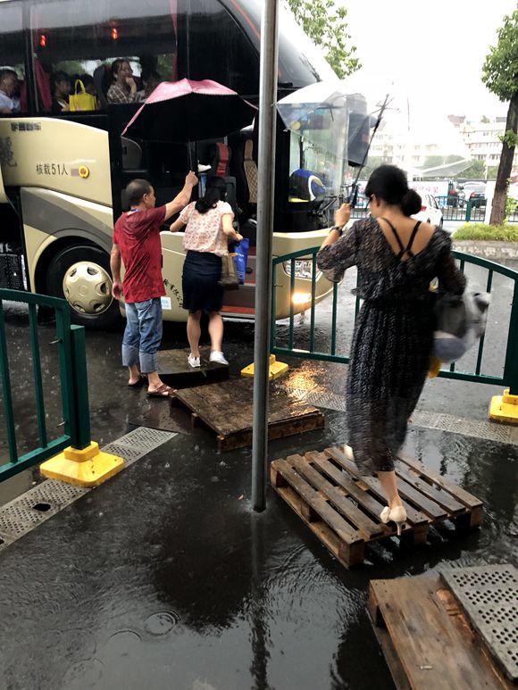 中秋佳節(jié)前夕,午后一場突如其來的滂沱大雨,地面積水一下子沒到了腳踝處,將麗水高鐵站的上車點堵住了。從高鐵下車轉(zhuǎn)乘客車的旅客上車成了一個大難題,幾位女乘客躍躍欲試,立刻又縮了回來。