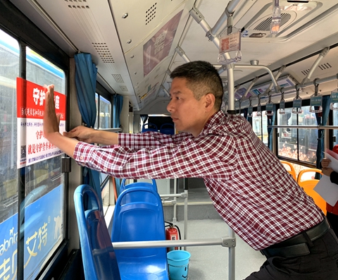 集團公司副總經理林周穎參加了公益活動,并為公交車張貼“守護員專座”標志。