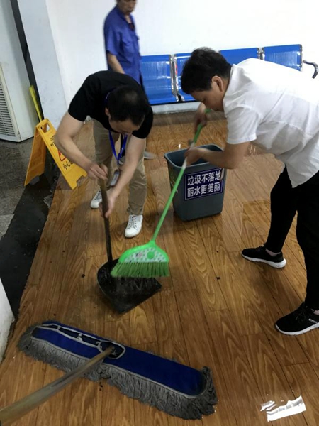 4月24日下午2點(diǎn)后,由于受強(qiáng)對(duì)流云團(tuán)影響,市區(qū)出現(xiàn)了7-9級(jí)大風(fēng),并伴有強(qiáng)雷電和大暴雨。由于這場雨下得又大又急,東站新舊候車廳交界處的下水管出現(xiàn)了倒灌現(xiàn)象,短短幾分鐘時(shí)間,新候車廳5、6號(hào)檢票口附近的地面就積滿了水。值班站長金翔見狀趕緊叫來工作人員和清潔工,不顧地面的積水和正在往下漏的雨水,合力進(jìn)行積水清理。他們拿起掃把、畚斗、垃圾桶、拖把等工具共同加入戰(zhàn)斗,一邊清理一邊不忘提醒過往的旅客注意腳下,防止滑倒。
