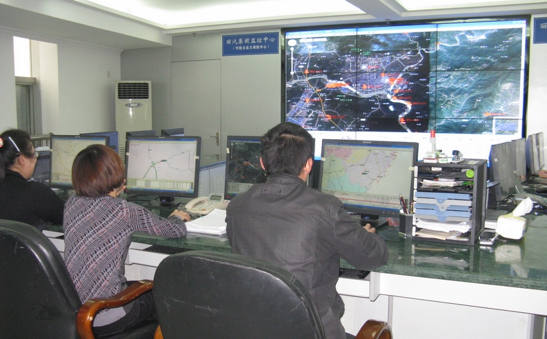 麗汽集團的工作人員在GPS系統(tǒng)監(jiān)控室監(jiān)控所屬的180多輛營運客運車輛運行狀況。