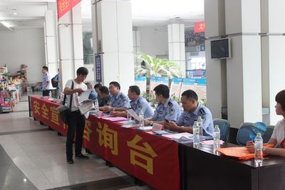 活動現(xiàn)場懸掛了安全生產(chǎn)宣傳標語,設(shè)置了安全咨詢臺,并在候車室前廳、中廳等人員聚集的位置,放置了各類以安全為主題的宣傳版畫,圖文并茂的向旅客宣傳了防詐騙、交通、防恐等安全知識。在整個活動期間,到咨詢臺來現(xiàn)場咨詢的旅客絡繹不絕,各單位咨詢?nèi)藛T還向旅客發(fā)放了《平安交通 人人有責》、《警民相約 共建和諧》、《公民防范恐怖襲擊手冊》、《為防范與遏制“電信(網(wǎng)絡)詐騙犯罪”致市民的一封信》等十余種安全生產(chǎn)宣傳資料共計2000余份,營造了安全生產(chǎn)月活動的良好氛圍。