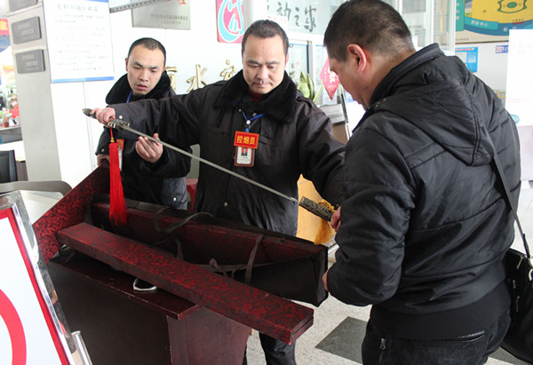 西站安檢崗位潘峰、金翔、鐘韶華值班三位同志在值班。今天客流量大,是平時的一倍左右,安檢員們工作也都比往常更認真仔細了。80:50分左右,鐘韶華、金翔發(fā)現(xiàn)一名男子提著三盒包裝精美的禮盒經(jīng)過安檢。鐘韶華忙禮貌上前將該男子叫到一邊,讓他開包檢查。經(jīng)檢查,三盒均為龍泉寶劍,其中兩把寶劍未開封可攜帶,一把寶劍已開封不能攜帶上車,按規(guī)定對這把寶劍進行了登記暫扣處理。該男子也很配合安檢員的工作,直夸安檢員們工作認真細致。