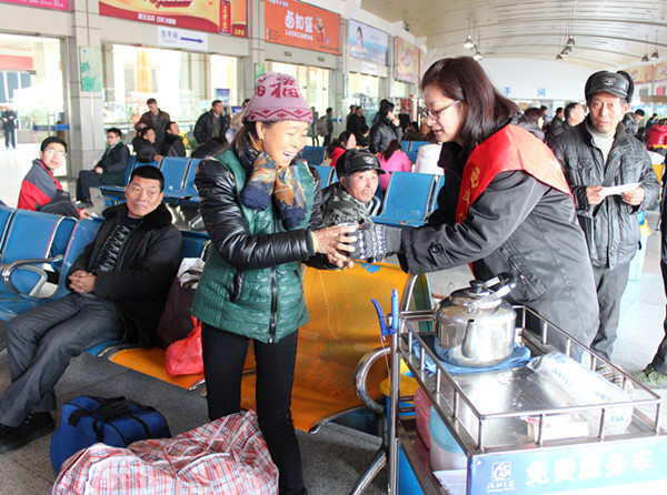 服務(wù)班的陳燕早早的推著服務(wù)車在候車室服務(wù),為春運第一天踏上回家旅途的人們免費送上一杯杯熱氣騰騰的開水。陳燕說,為旅客服務(wù)是她的本職工作,農(nóng)民工兄弟們在外工作了一年才回一趟家,她和姐妹們要盡自己所能,為他們提供最優(yōu)質(zhì)的服務(wù)。服務(wù)班已備好了生姜茶,隨著氣溫的下降,姐妹們將會推車送姜茶服務(wù),為他們回家的途中送上一抹溫暖。