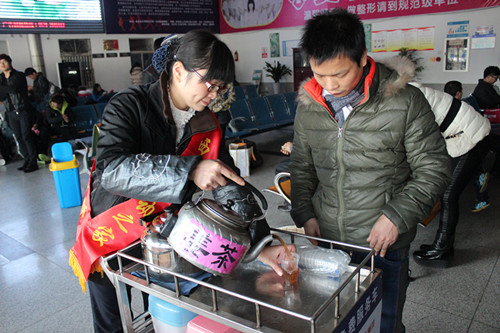 昨天進入到大寒節(jié)氣,今天馬上就有一股冷空氣來應(yīng)景,氣溫有小幅的下降。一大早西站“流動之家”服務(wù)班的姐們就準備好一大壺?zé)釟怛v騰的姜茶,免費為候車大廳的旅客送上熱姜茶,幫助他們驅(qū)去寒意,溫暖回家的旅程。
