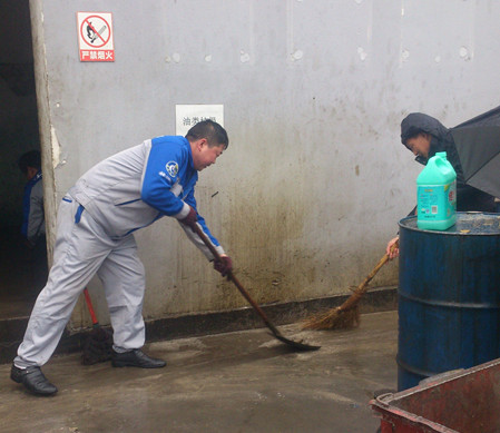 員工正在清理費油儲藏室地面的油污