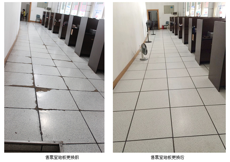 客運(yùn)西站主樓一層售票室和消防監(jiān)控室的防靜電地板因使用多年,破損嚴(yán)重,影響了西站整體的美觀。為了保持西站良好的窗口形象和符合創(chuàng)建國家衛(wèi)生城市的要求,近日,西站對售票室和消防監(jiān)控室的防靜電地板進(jìn)行更新。