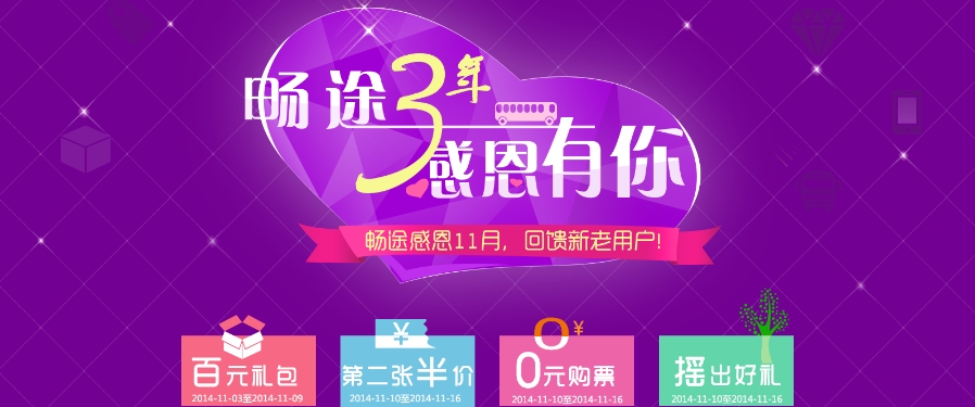 為了慶祝暢途網(wǎng)成立3周年,在11月份,暢途網(wǎng)推出了一整月的活動(dòng),有:11.3-11.9購(gòu)票送百元禮包,11.10-11.16第二張票半價(jià),11.17-11.23 0元購(gòu)票,11.24-11.30搖錢樹送好禮。活動(dòng)多多,優(yōu)惠多多,讓大家在輕松享受購(gòu)票的同時(shí),帶給大家更多的實(shí)惠與樂(lè)趣!