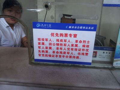 6月5日,走進客運東站的候車大廳,細心的旅客就會發(fā)現(xiàn),售票窗口新增了老人優(yōu)先購票的溫馨提示,以及每排候車座椅都設(shè)置了兩個老人專座。原來,這是客運東站根據(jù)麗水市政府〔2006〕28號精神,為進一步方便老年旅客到東站購票、候車,而在開設(shè)特殊旅客購票窗口和綠色通道的基礎(chǔ)上增設(shè)的老人購票專窗、老人專座。