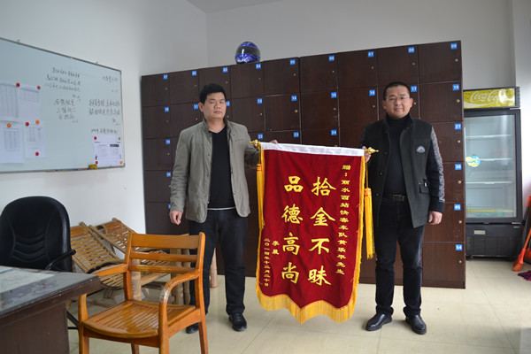 12月21日下午2點(diǎn),失而復(fù)得4萬(wàn)現(xiàn)金的李先生手拿錦旗來(lái)到快客車隊(duì),一再對(duì)黃樂(lè)平師傅拾金不昧的行為精神表示感謝,他說(shuō):“黃樂(lè)平師傅在發(fā)現(xiàn)遺失物品時(shí),能夠包管完好,可見(jiàn)平時(shí)他就是一位非常盡責(zé)的駕駛員。那天我發(fā)現(xiàn)丟了4萬(wàn)元現(xiàn)金的時(shí)候,我頓時(shí)全身冒冷汗,這可怎么辦好呢。當(dāng)我趕回麗水,看到拉桿箱好好的放在這里時(shí),我懸著的心終于放下了?!崩钕壬f(shuō):“今天我送來(lái)一面錦旗,就是再次感謝敬業(yè)的黃師傅,感謝公司培養(yǎng)出的駕駛員如此優(yōu)秀,希望公司能多宣傳正能量,多表?yè)P(yáng)黃師傅這樣的好人”說(shuō)著,李先生將一面印有“拾金不昧 品德高尚”的錦旗送到余副經(jīng)理手中(因黃樂(lè)平出車,未能和乘客碰面)。