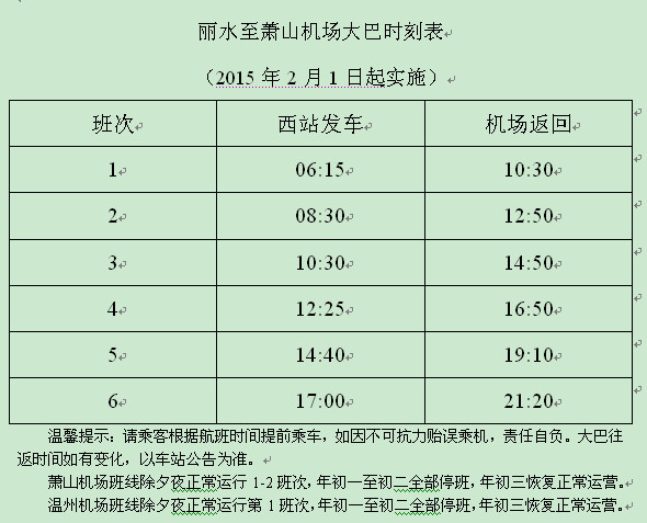 為更加方便市民出行需要,從2月1日起,麗水到蕭山機(jī)場(chǎng)的客運(yùn)班車從原來的4個(gè)班次增加到6個(gè)班次。每天的6:15、8:30、10:30、12:25、14:40、17:00從客運(yùn)西站發(fā)車,蕭山機(jī)場(chǎng)則在每天的10:30、12:50、14:50、16:50、19:10和21:20返回。需要到蕭山機(jī)場(chǎng)的乘客只要在客運(yùn)西站售票窗口、銀聯(lián)卡自助售票機(jī)或現(xiàn)金自助售票機(jī)上買票上車即可。
