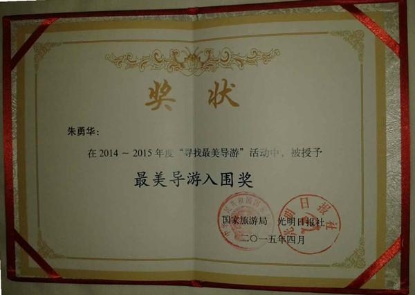 朱勇華是麗水市首屆金牌導(dǎo)游,麗水市首批五養(yǎng)技能大師,并曾榮獲金牌導(dǎo)游大賽“最佳才華獎(jiǎng)”、2011年“古堰畫(huà)鄉(xiāng)”杯導(dǎo)游技能大賽二等獎(jiǎng)。