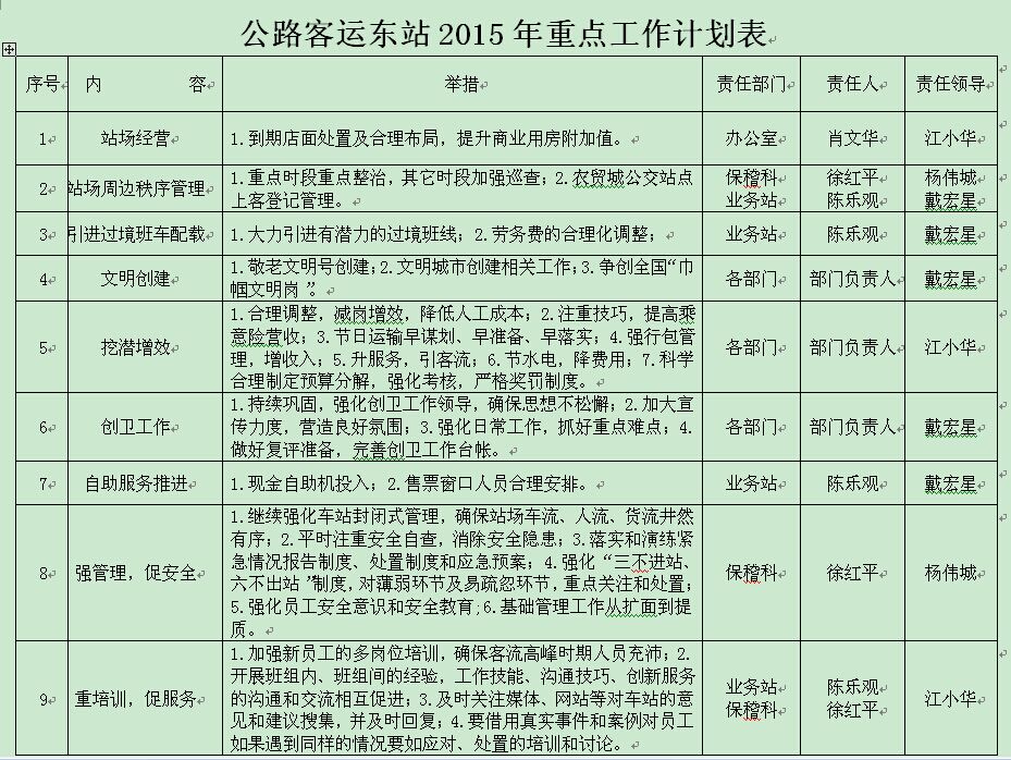 根據(jù)《集團(tuán)公司董事會工作報(bào)告》經(jīng)營目標(biāo)及戰(zhàn)略重點(diǎn),緊密結(jié)合東站工作實(shí)際,客運(yùn)東站制定2015年重點(diǎn)工作計(jì)劃,重點(diǎn)做好九項(xiàng)工作: