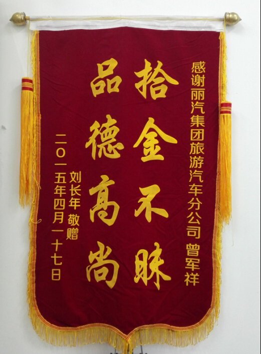 5月5日,一位叫劉長(zhǎng)年的旅客拿著錦旗滿懷激動(dòng)得來(lái)我們旅游汽車分公司尋找駕駛員曾軍祥,想借此錦旗當(dāng)面好好謝謝這位好心的駕駛員。