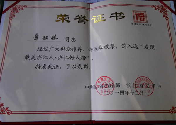 “發(fā)現(xiàn)最美浙江人--浙江好人榜”推薦評(píng)選活動(dòng)由省委宣傳部、省文明辦聯(lián)合開展,每月推薦評(píng)選一次,旨在為大力培育和弘揚(yáng)社會(huì)主義核心價(jià)值觀,積極普及和踐行當(dāng)代浙江人共同價(jià)值觀,進(jìn)一步深化“發(fā)現(xiàn)‘最美浙江人’、爭(zhēng)做‘最美浙江人’”主題宣傳實(shí)踐活動(dòng),健全和完善“浙江好人”選樹和培育機(jī)制,推動(dòng)“最美”從“盆景”變成“風(fēng)景”、從“風(fēng)景”變?yōu)椤帮L(fēng)尚”。推薦評(píng)選分為助人為樂(lè)類、見(jiàn)義勇為類、誠(chéng)實(shí)守信類、敬業(yè)奉獻(xiàn)類和孝老愛(ài)親類五個(gè)類別。評(píng)選活動(dòng)經(jīng)過(guò)網(wǎng)絡(luò)投票、群眾評(píng)議、專家評(píng)審等環(huán)節(jié),12月份共評(píng)選出25名浙江好人,章雙林入選見(jiàn)義勇為類浙江好人。