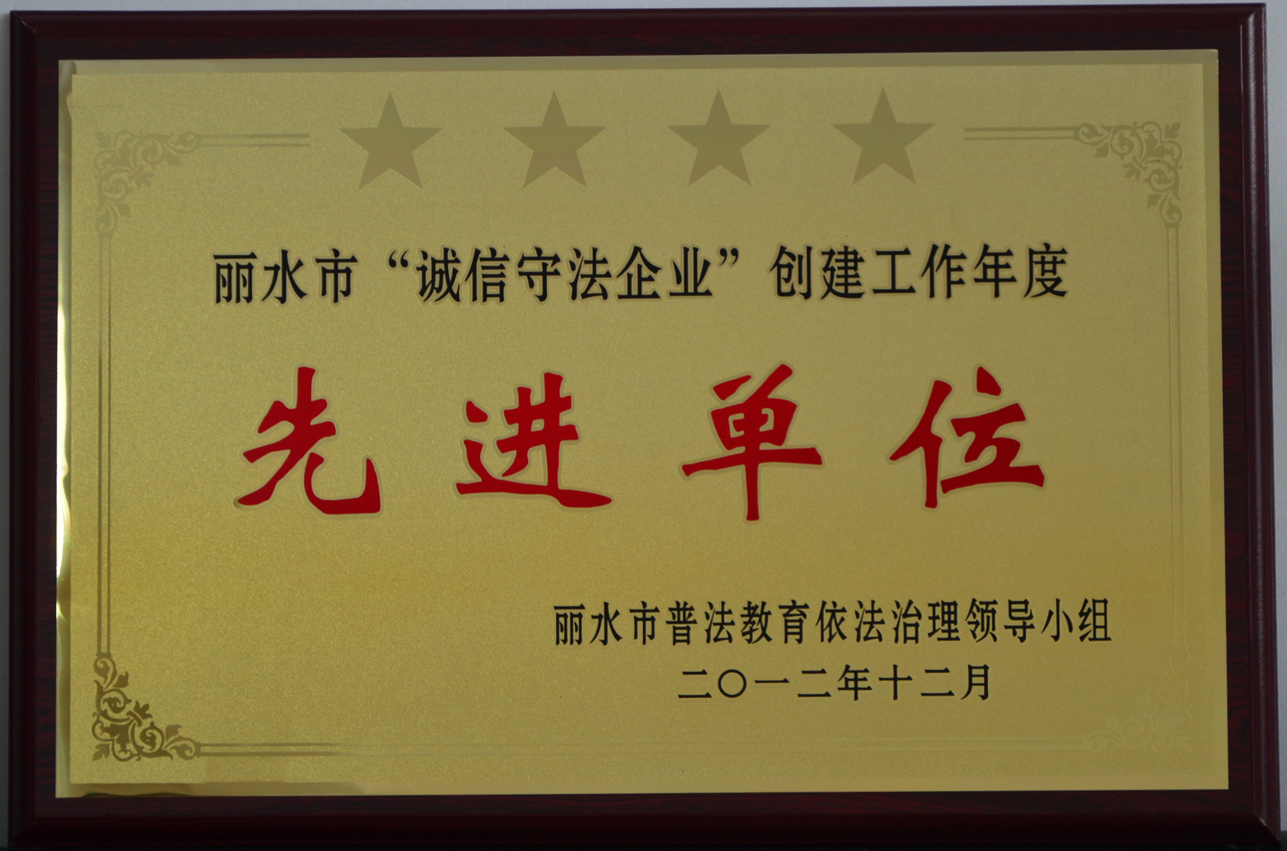日前,集團(tuán)公司被評(píng)為麗水市“誠(chéng)信守法企業(yè)”創(chuàng)建工作先進(jìn)單位。這是集團(tuán)公司繼獲得麗水市“五五”普法先進(jìn)單位以來獲得的又一項(xiàng)市級(jí)榮譽(yù)。近兩年來,集團(tuán)公司內(nèi)抓管理,外樹形象,在抓好普法工作和職業(yè)道德教育的基礎(chǔ)上,進(jìn)一步加強(qiáng)企業(yè)誠(chéng)信守法建設(shè),加大依法經(jīng)營(yíng)力度,打造誠(chéng)信守法品牌,履行社會(huì)責(zé)任,全面提高了企業(yè)綜合競(jìng)爭(zhēng)力。同時(shí),也為優(yōu)化市場(chǎng)經(jīng)濟(jì)環(huán)境,維護(hù)經(jīng)濟(jì)秩序,有效保障企業(yè)健康發(fā)展做出了貢獻(xiàn)。