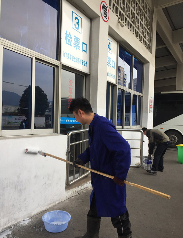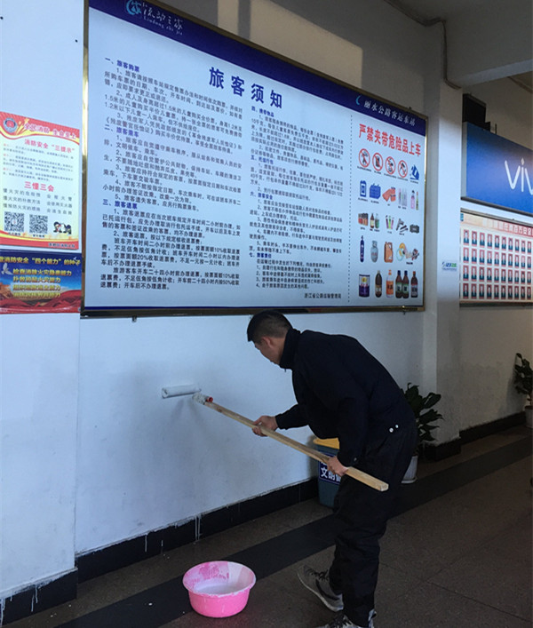 春節(jié)的腳步越來越近,為了提升站場的整體形象。1月13日下午亮點(diǎn),東站黨員志愿服務(wù)隊(duì)的隊(duì)員們在支部書記江小華的帶領(lǐng)下對候車廳、過道、辦公室走廊、樓梯口等墻壁進(jìn)行粉刷。