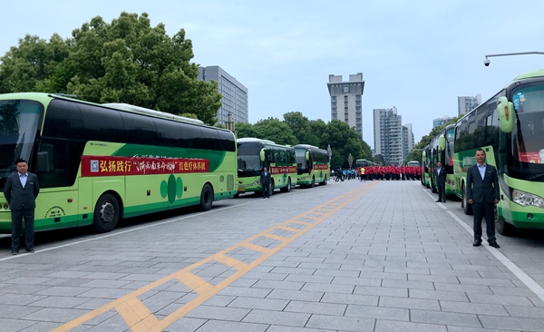 4月19日早上,在市政府南門廣場,麗汽集團旅游汽車分公司16輛綠色豪華大巴齊刷刷地排列著,16位駕駛員統(tǒng)一著裝,整齊劃一地站在車門迎候游客。這是2019年麗水市弘揚踐行“浙西南革命精神”系列活動啟動儀式暨勞模、一線(優(yōu)秀)職工紅色療休養(yǎng)活動發(fā)團儀式的現(xiàn)場。綠色大巴與著紅色服裝的先進(jìn)相互映襯,形成了“紅+綠”融合發(fā)展的場景,和諧的畫面吸引了在場人員的關(guān)注,紛紛拿出手機拍場景,曬朋友圈。