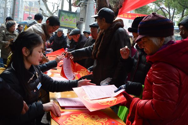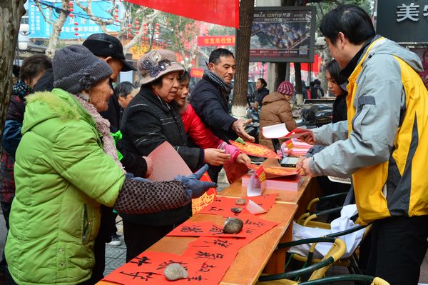 “貼上真正寫的春聯(lián),才有過年的味道”,一位排隊(duì)等候的姑娘對蘭老的字情有獨(dú)鐘。家住白云小區(qū)的齊大媽更是感慨自己已65歲,上還有90歲高齡母親,非要請?zhí)m老寫下:“今日正逢萱草壽,前身合是杏花仙”,橫披“九十大壽”對聯(lián),作為母親九十大壽的賀禮。拿到對聯(lián)后的齊大媽稱心滿意地說:“今天我非常高興、開心,你們這么冷的天為我們義務(wù)寫對聯(lián),抽出休息時間為人民服務(wù),祝福你們麗汽集團(tuán)生意越做越大?!?br/> 黨員們在中山街上頂著寒風(fēng),冒著嚴(yán)寒,不斷為市民們送福字,寫對聯(lián),送對聯(lián),把暖暖的祝福送給市民。據(jù)統(tǒng)計(jì),集團(tuán)公司黨員服務(wù)一條街,送出“福”字1500余張,送出對聯(lián)200余副,發(fā)放班車時刻表、旅游信息表等1000余張。
