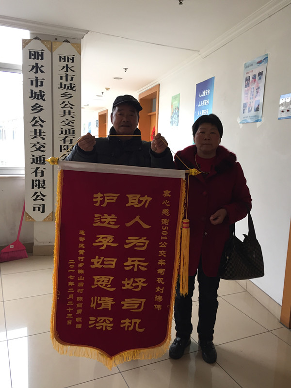 2月23日,麗水市城鄉(xiāng)公交公司的辦公室來(lái)了一對(duì)樸實(shí)的夫婦,他們拿著一面印有“護(hù)送孕婦恩情深,助人為樂好司機(jī)”字樣的錦旗,指明要送給501路公交車司機(jī)劉海偉:“多虧了劉師傅幫忙,我兒媳婦才平安生下了大胖小子!”