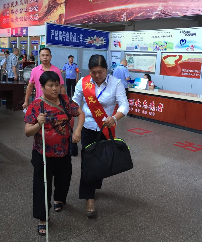 大姐的眼睛因?yàn)橐荒昵暗昧思膊?dǎo)致看不見(jiàn),今天到東站準(zhǔn)備坐車(chē)去縉云。當(dāng)時(shí)正在售票廳引導(dǎo)一米線(xiàn)的毛麗珍看到了正慢慢摸索、一步步小心翼翼往前走的大姐。她趕緊上前扶著大姐并幫她購(gòu)買(mǎi)了去縉云的車(chē)票,看她行走不方便,毛麗珍就一路扶著她,并一直送她到車(chē)上。別看毛麗珍人長(zhǎng)得大個(gè),可她的心卻細(xì)著,哪里需要轉(zhuǎn)彎,哪里有臺(tái)階,哪里需要注意的,她都一一耐心的提醒大姐小心注意。